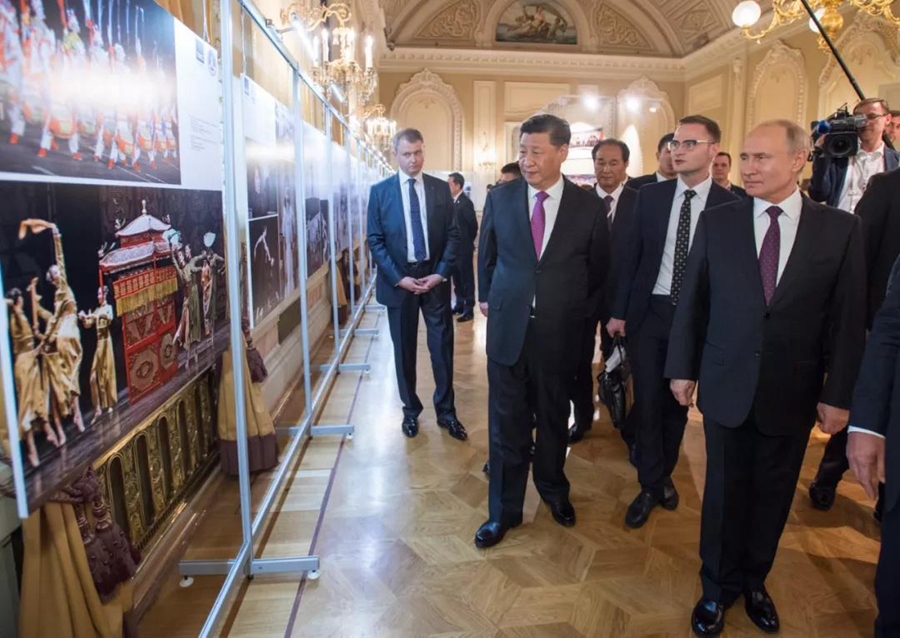 ↑6月5日,习主席和普京总统在莫斯科大剧院共同出席中俄建交70周年纪念活动。活动前,两国元首共同参观中俄建交70周年图片展。新华社记者李学仁摄