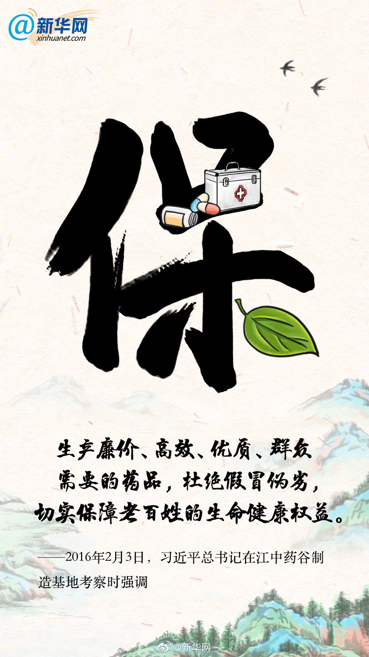 2016年2月3日,习近平总书记在江中药谷制造基地考察时强调,医疗保健是全面建成小康社会的重要方面,要下大气力抓好,生产廉价、高效、优质、群众需要的药品,杜绝假冒伪劣,切实保障老百姓的生命健康权益。