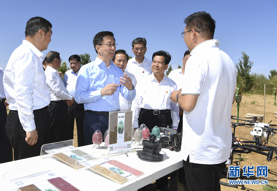 8月26日至27日,中共中央政治局常委、国务院副总理韩正到内蒙古自治区鄂尔多斯市,就库布其沙漠防沙治沙和生态建设情况进行调研。这是8月27日,韩正在那日沙科技植树区,考察运用技术创新植树治沙工作开展情况。 新华社记者 张领 摄