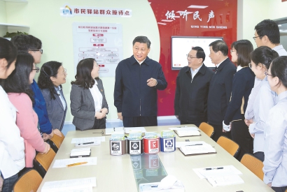 2018年11月6日至7日,中共中央总书记、国家主席、中央军委主席习近平在上海考察。这是6日上午,习近平在虹口区市民驿站嘉兴路街道第一分站,同几位正在交流社区推广垃圾分类的做法的年轻人亲切交谈。 新华社 发(资料照片)