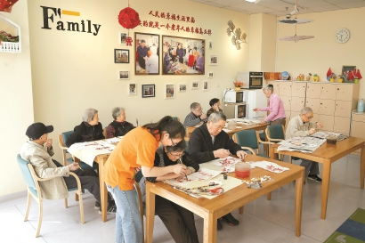 虹口区市民驿站托老所里,88岁老人朱德明一边画水墨画,一边感慨,“我越来越留恋这里了”;