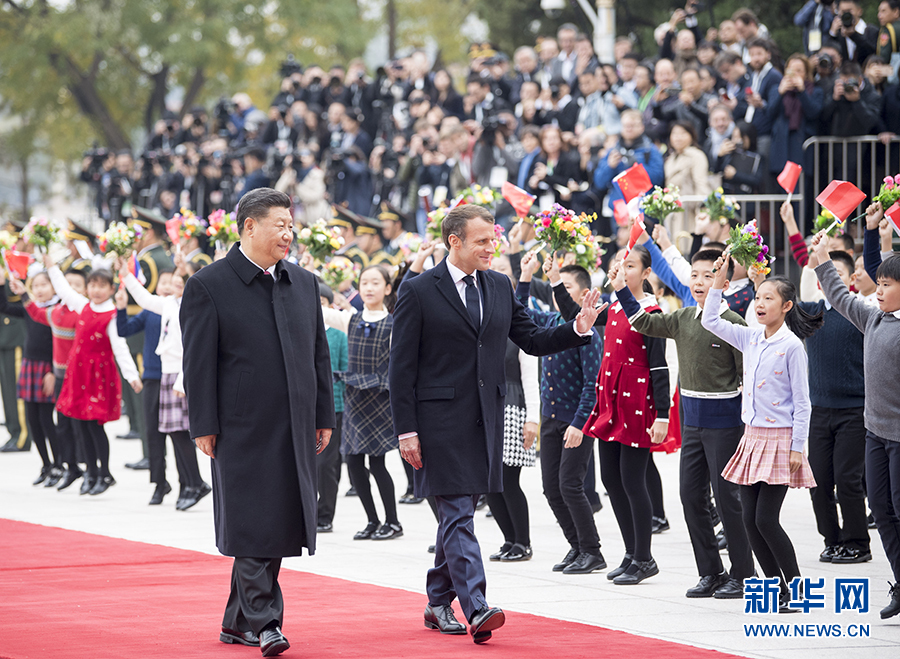 11月6日,国家主席习近平在北京人民大会堂同法国总统马克龙会谈。这是会谈前,习近平在人民大会堂东门外广场为马克龙举行欢迎仪式。 新华社记者 李学仁 摄