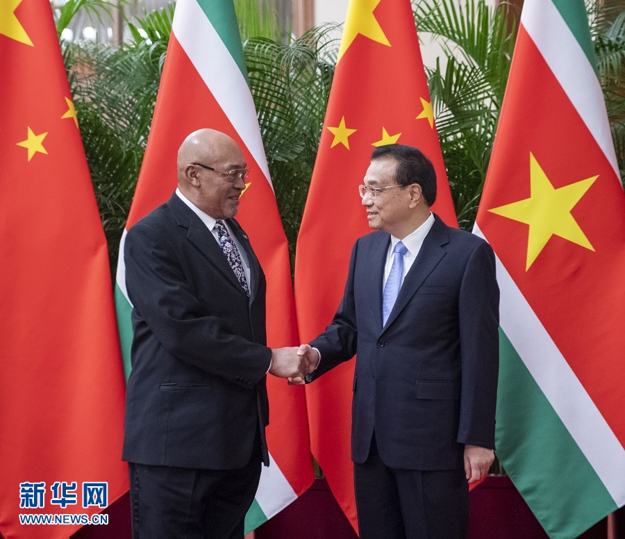 李克强表示,中国和苏里南虽然相隔万里,但两国人民之间友好情谊深厚。建交40多年来,双边关系始终健康稳定发展。习近平主席将同总统先生举行会谈,推动中苏关系迈上新台阶。我们愿继续在相互尊重、平等相待的基础上,同苏方增进政治互信,对接发展战略,促进务实合作,扩大人文交流,更好实现互利共赢。