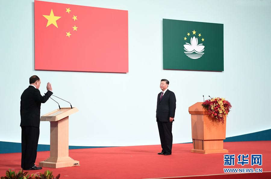 12月20日,庆祝澳门回归祖国20周年大会暨澳门特别行政区第五届政府就职典礼在澳门东亚运动会体育馆隆重举行。中共中央总书记、国家主席、中央军委主席习近平出席并发表重要讲话。这是习近平监誓,澳门特别行政区第五任行政长官贺一诚宣誓就职。 新华社记者 谢环驰 摄