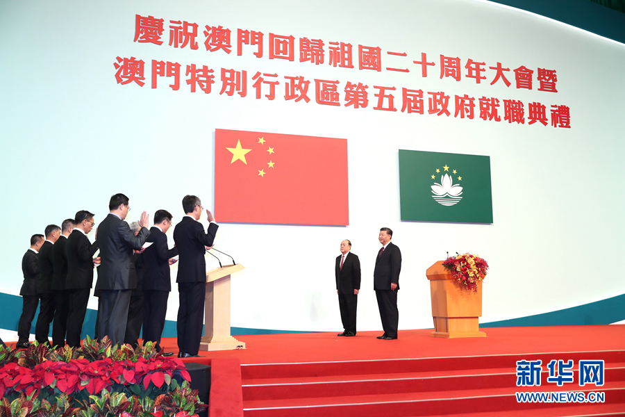 12月20日,庆祝澳门回归祖国20周年大会暨澳门特别行政区第五届政府就职典礼在澳门东亚运动会体育馆隆重举行。中共中央总书记、国家主席、中央军委主席习近平出席并发表重要讲话。由习近平监誓,澳门特别行政区第五届政府主要官员在澳门特区第五任行政长官贺一诚带领下宣誓就职。 新华社记者 鞠鹏 摄