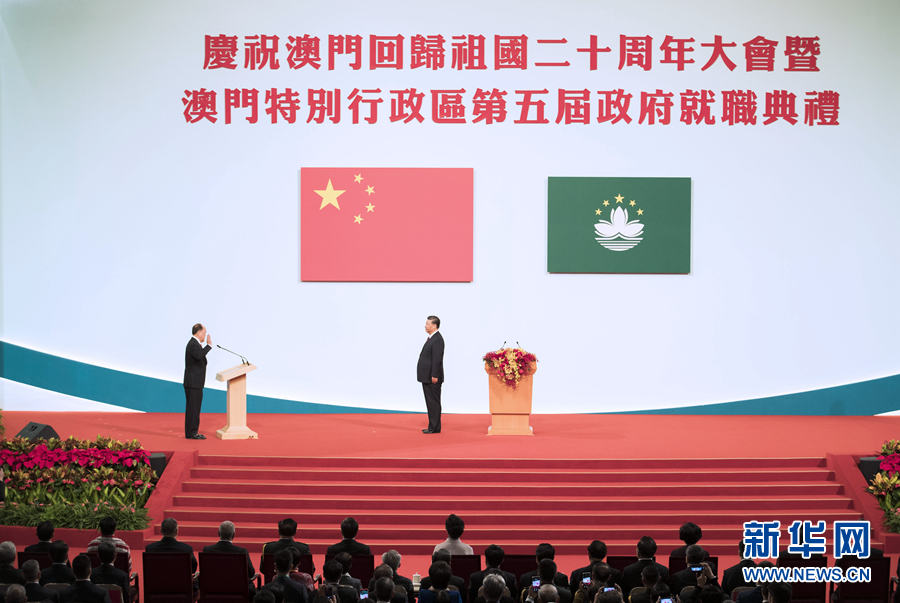 12月20日,庆祝澳门回归祖国20周年大会暨澳门特别行政区第五届政府就职典礼在澳门东亚运动会体育馆隆重举行。中共中央总书记、国家主席、中央军委主席习近平出席并发表重要讲话。这是习近平监誓,澳门特别行政区第五任行政长官贺一诚宣誓就职。 新华社记者 黄敬文 摄