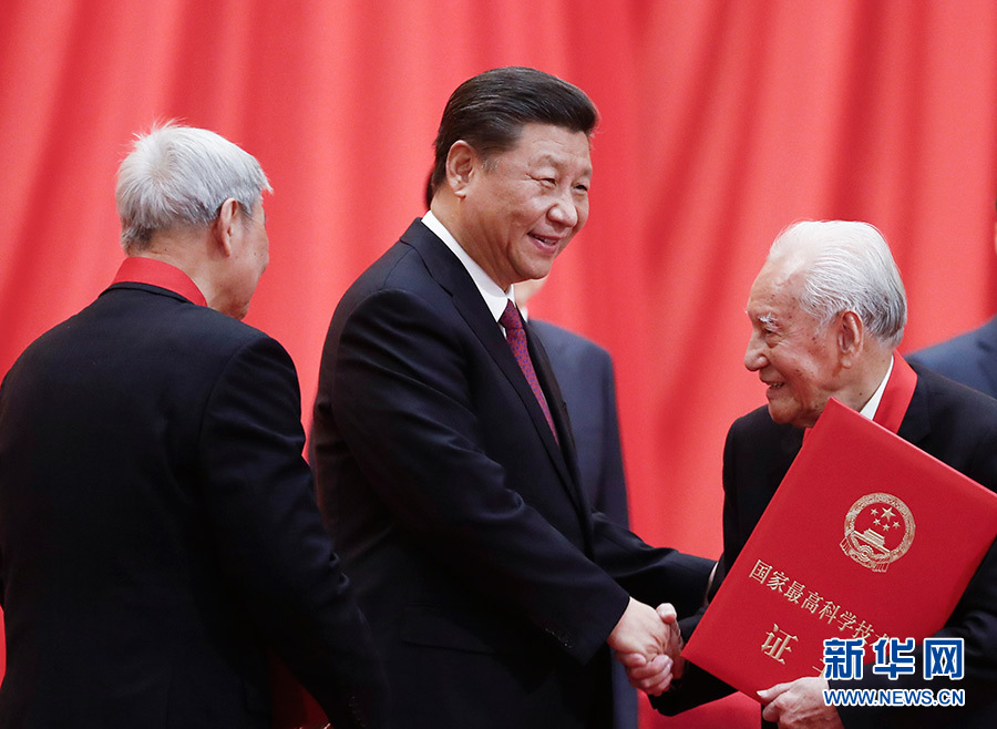 1月10日,2019年度国家科学技术奖励大会在北京人民大会堂隆重举行。中共中央总书记、国家主席、中央军委主席习近平向获得2019年度国家最高科学技术奖的原中国船舶重工集团公司第七一九研究所黄旭华院士(右)和中国科学院大气物理研究所曾庆存院士(左)颁奖。 新华社发(盛佳鹏 摄)