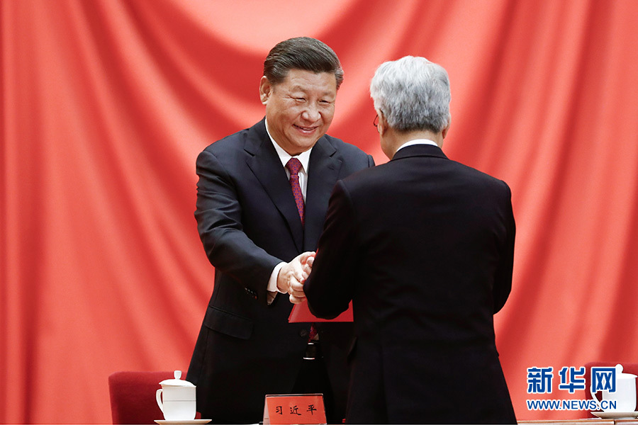 1月10日,2019年度国家科学技术奖励大会在北京人民大会堂隆重举行。这是中共中央总书记、国家主席、中央军委主席习近平向获奖代表颁发证书。 新华社发(盛佳鹏 摄)
