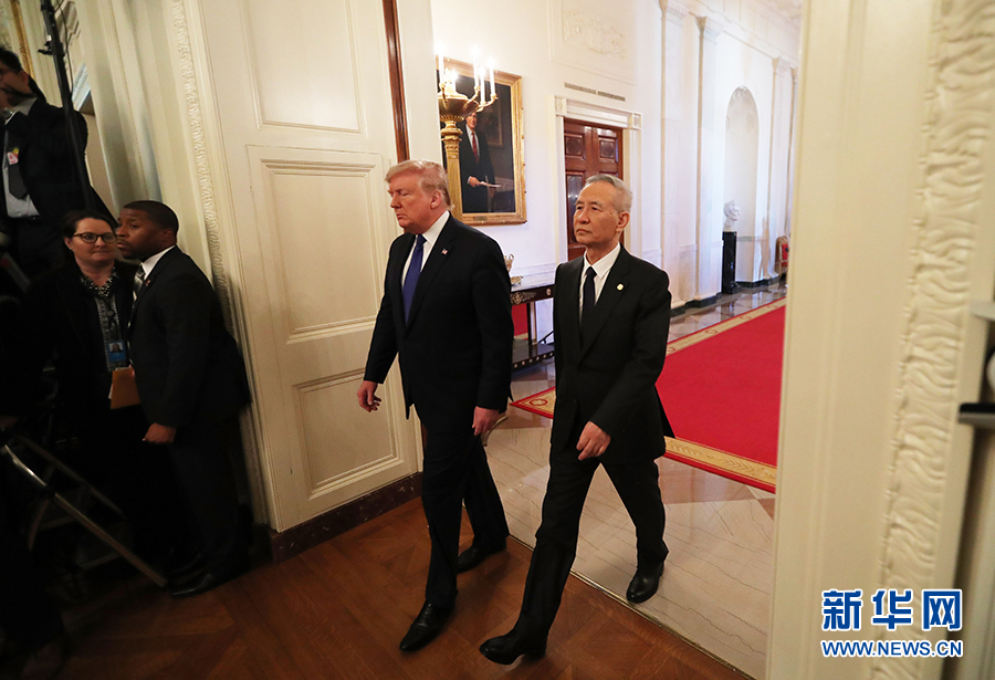 当地时间1月15日上午,中共中央政治局委员、国务院副总理、中美全面经济对话中方牵头人刘鹤(右)与美国总统特朗普抵达华盛顿白宫东厅,准备参加中美第一阶段经贸协议签署仪式。 新华社记者 王迎 摄