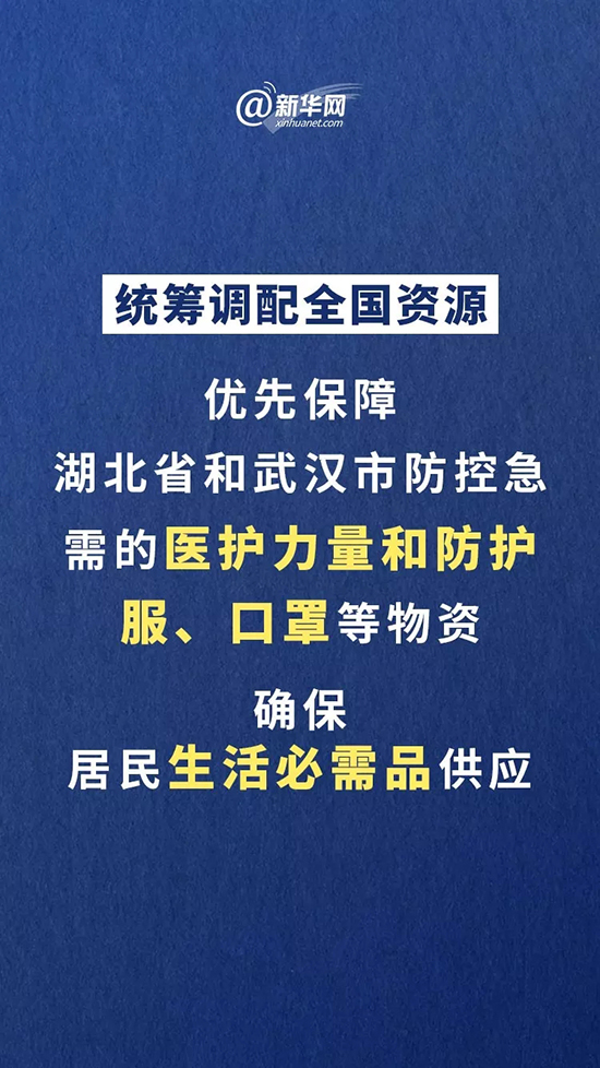 会议强调,要突出重点,进一步加强湖北省和武汉市疫情防控。中央向湖北派出指导组,推动加强防控一线工作。统筹调配全国资源,优先保障湖北省和武汉市防控急需的医护力量和防护服、口罩等物资,确保居民生活必需品供应,物资调运实行绿色通道。湖北省和武汉市要层层落实责任,加快建设集中收治医院、改造酒店作为隔离区,做好发热病人及时诊治,防范发生次生问题。加强医护人员轮换和防护,缓解他们的身体和心理压力。严格做好城乡结合部、省市边界人流进出管理,做到外防输出、内防扩散。