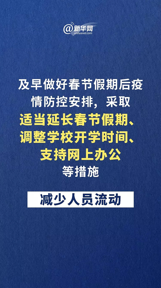 会议要求,要加强分类指导,压实属地责任,精准有效科学防控。各地要成立应对疫情工作领导小组,党政主要负责人要亲自挂帅,防控工作不得有误。加强疫情监测,严格隔离确诊患者,对疑似病例和密切接触者要按医学要求进行隔离和检查。发病人数较多城市要抓紧增加定点医院、治疗床位和隔离点。推迟、减少会议和大型活动。落实公共场所和交通工具检控措施。农村医疗卫生条件薄弱,农民工大批返乡,要高度重视农村疫情防控,充分发挥基层组织和村医作用,强化群防群控。及早做好春节假期后疫情防控安排,采取适当延长春节假期、调整学校开学时间、支持网上办公等措施,减少人员流动。严厉打击防控物资囤积居奇等行为。各级财政要充分保障疫情防控、患者救治等经费。