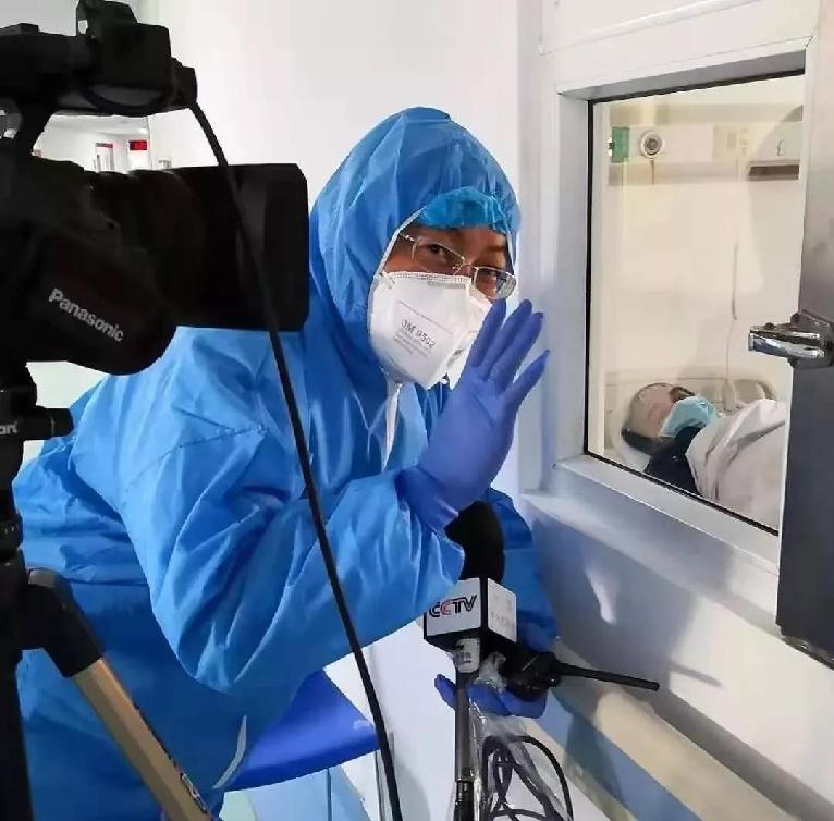 中央广播电视总台记者蒋晓平在武汉市金银潭医院采访。