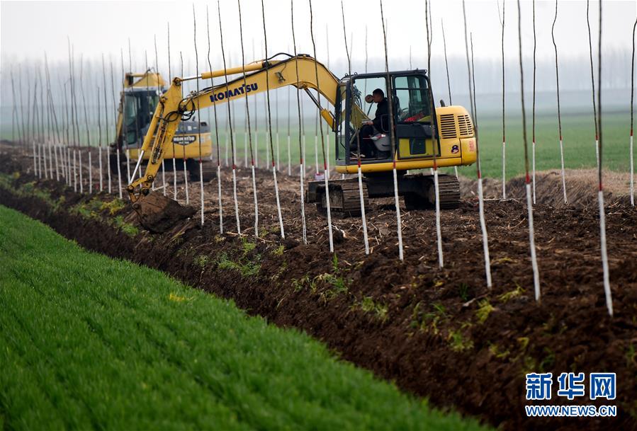 在河南新蔡县余店镇,工作人员使用机械进行高标准农田建设(2月29日摄)。 新华社发(宋超喜摄)