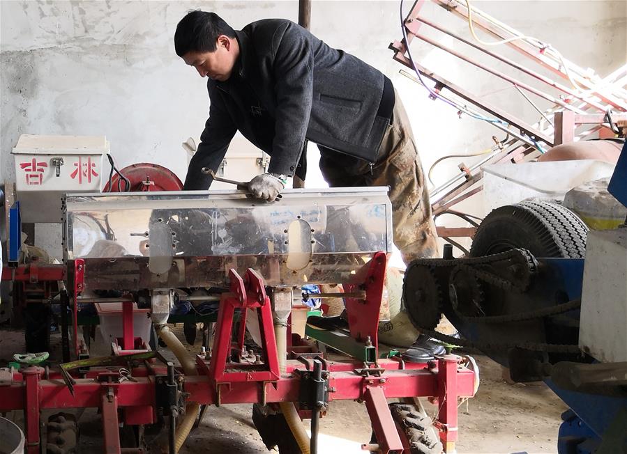 2月26日,吉林省公主岭市环岭乡齐心农民专业合作社农民在维修农机。 新华社记者 薛钦峰 摄