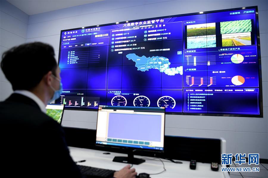 在四川省大邑县四川润地数字农业中心,技术人员使用数字农业监管平台查看农作物各项数据(2月24日摄)。 新华社记者 王曦 摄
