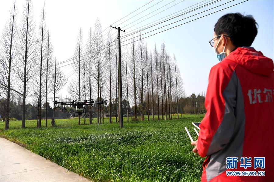 在四川省崇州市崇庆街道红桥村,技术人员操作农业植保无人机(2月25日摄)。 新华社记者 王曦 摄
