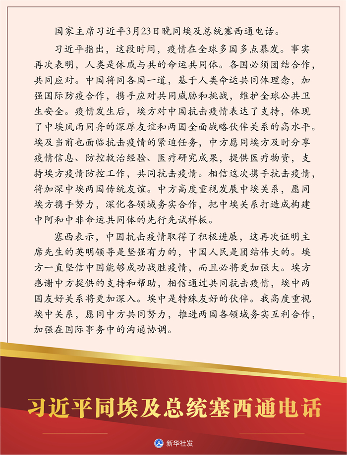 习近平指出,这段时间,疫情在全球多国多点暴发。事实再次表明,人类是休戚与共的命运共同体。各国必须团结合作,共同应对。中国将同各国一道,基于人类命运共同体理念,加强国际防疫合作,携手应对共同威胁和挑战,维护全球公共卫生安全。疫情发生后,埃方对中国抗击疫情表达了支持,体现了中埃风雨同舟的深厚友谊和两国全面战略伙伴关系的高水平。埃及当前也面临抗击疫情的紧迫任务,中方愿同埃方及时分享疫情信息、防控救治经验、医疗研究成果,提供医疗物资,支持埃方疫情防控工作,共同抗击疫情。相信这次携手抗击疫情,将加深中埃两国传统友谊。中方高度重视发展中埃关系,愿同埃方携手努力,深化各领域务实合作,把中埃关系打造成构建中阿和中非命运共同体的先行先试样板。