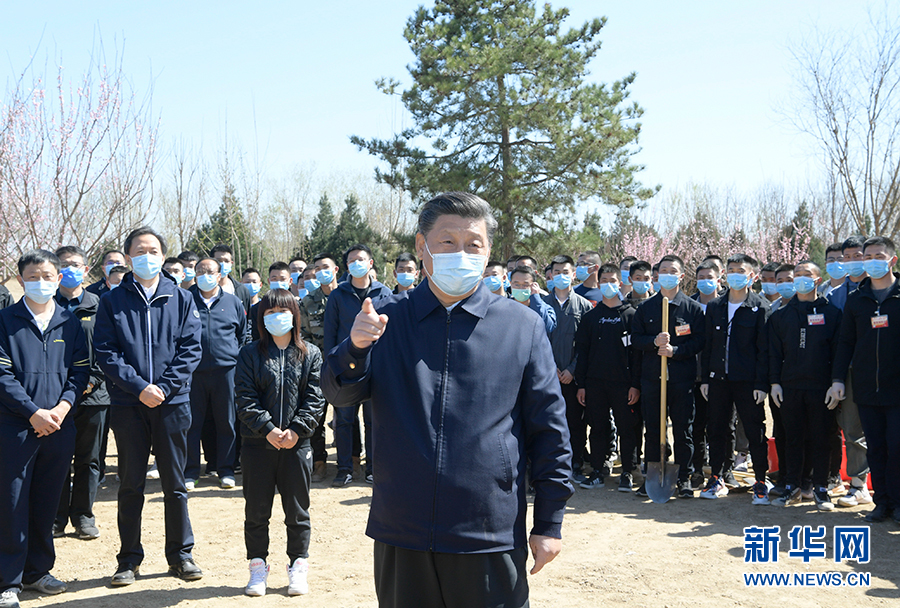 4月3日,党和国家领导人习近平、李克强、栗战书、汪洋、王沪宁、赵乐际、韩正、王岐山等来到北京市大兴区旧宫镇参加首都义务植树活动。这是植树期间,习近平同在场的干部群众亲切交谈。 新华社记者 李学仁 摄