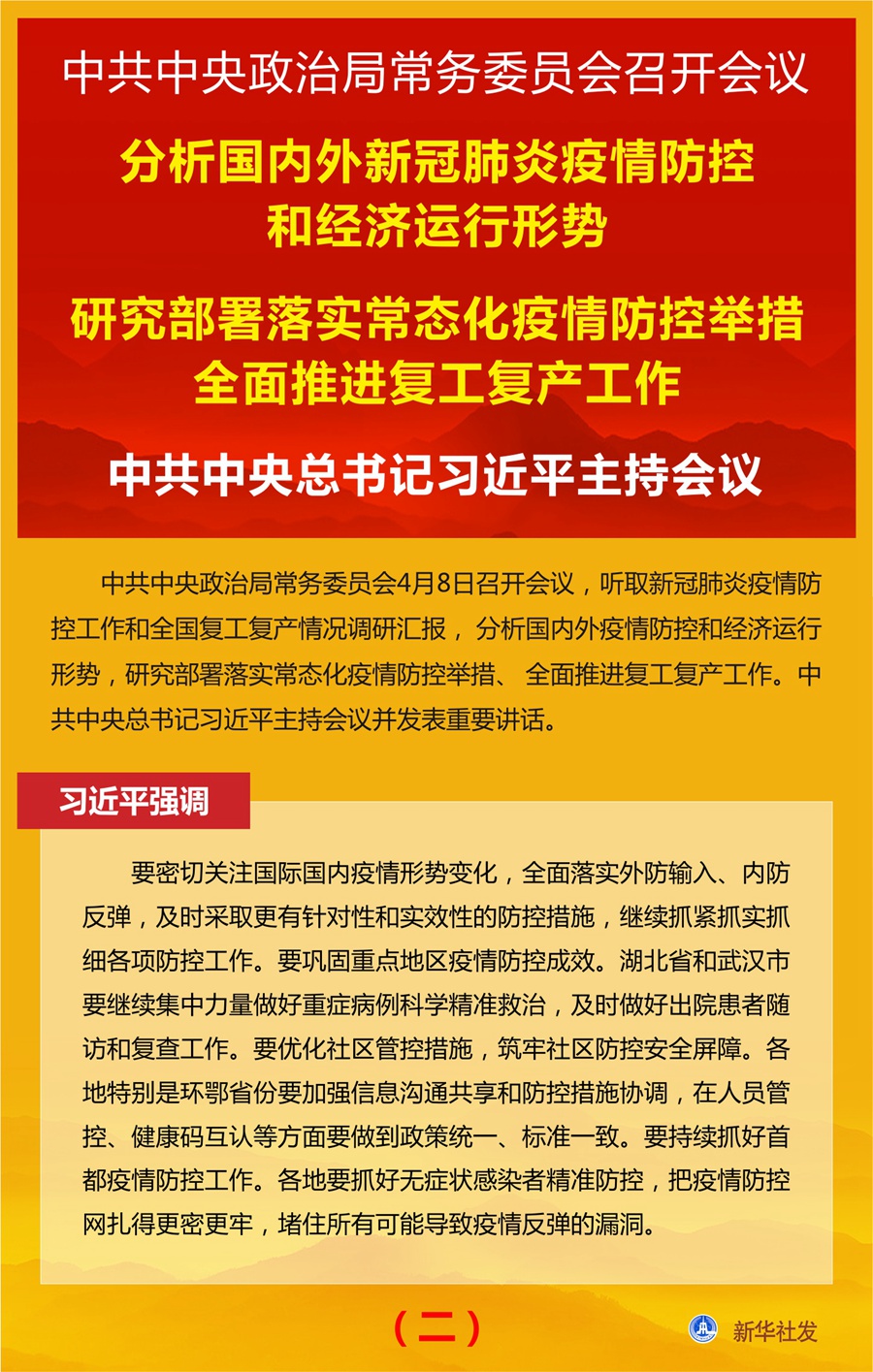 图表:中共中央政治局常务委员会召开会议 分析国内外新冠肺炎疫情防控和经济运行形势 研究部署落实常态化疫情防控举措全面推进复工复产工作 中共中央总书记习近平主持会议(二) 新华社发