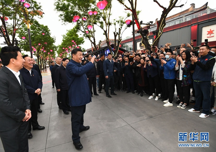 4月20日至23日,中共中央总书记、国家主席、中央军委主席习近平在陕西考察。这是4月22日,习近平在西安大唐不夜城步行街考察时,向游客挥手致意。 新华社记者 谢环驰 摄