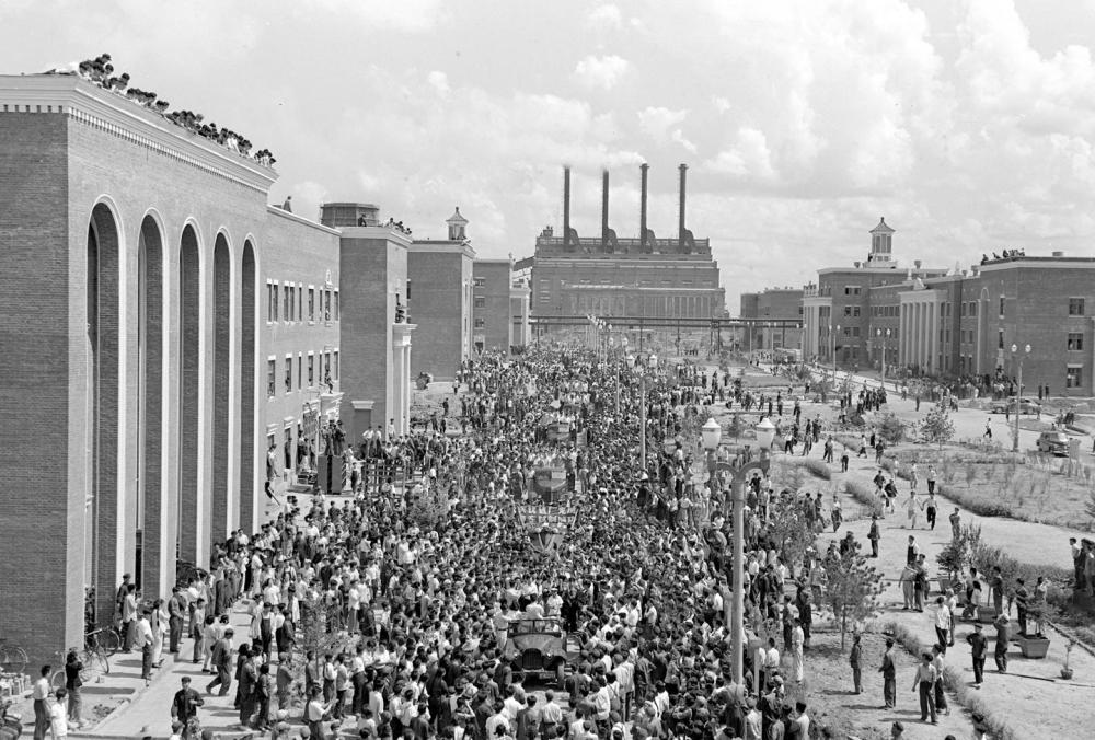 1956年7月,第一批国产解放牌载重汽车开出长春第一汽车制造厂报喜的时候,全厂职工夹道欢呼。新华社发(资料照片)