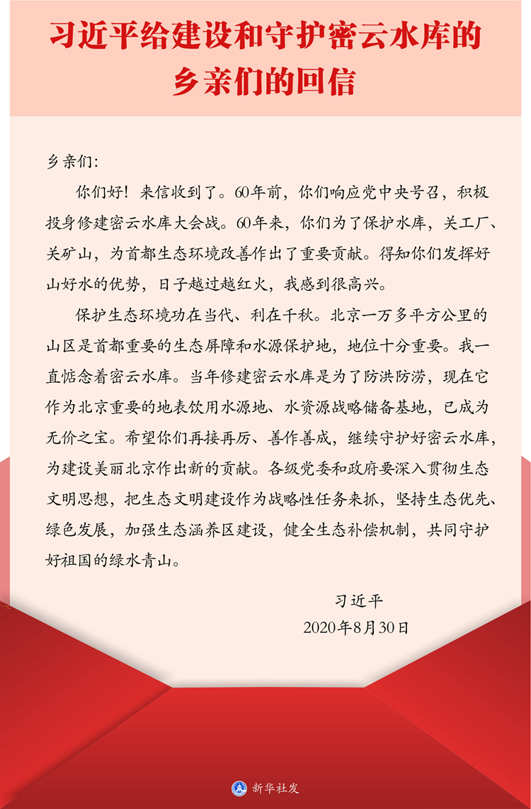 新华社北京8月31日电 习近平给建设和守护密云水库的乡亲们的回信