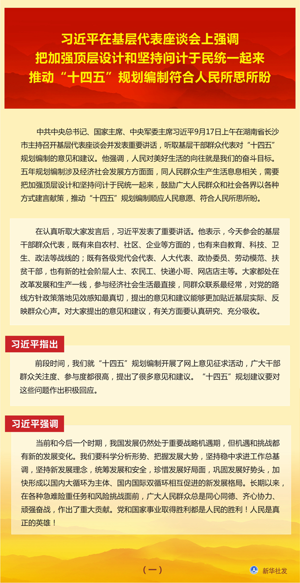 图表:习近平在基层代表座谈会上强调 把加强顶层设计和坚持问计于民统一起来 推动“十四五”规划编制符合人民所思所盼(一) 新华社发