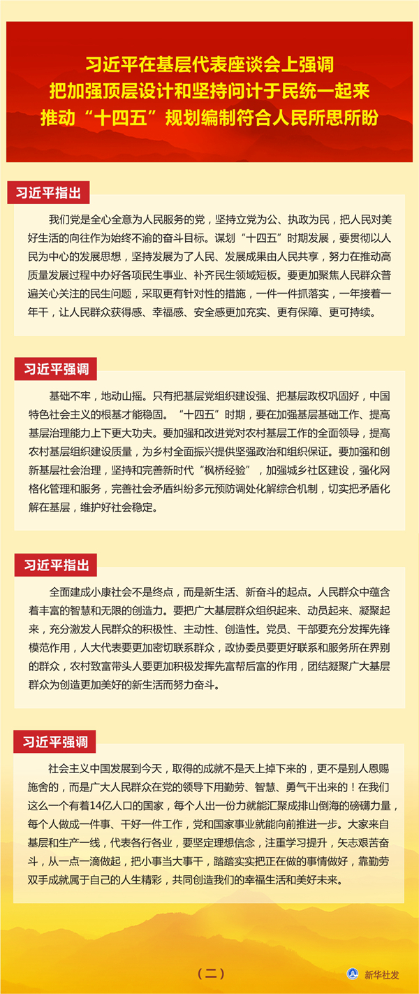 图表:习近平在基层代表座谈会上强调 把加强顶层设计和坚持问计于民统一起来 推动“十四五”规划编制符合人民所思所盼(二) 新华社发