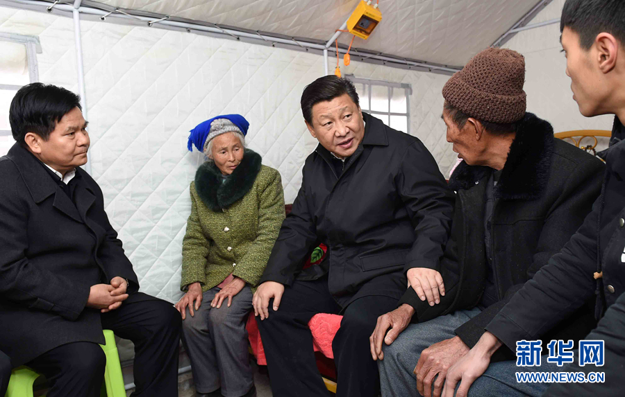 2015年1月19日,习近平来到云南省鲁甸县小寨镇甘家寨红旗社区过渡安置点,走进邹体富老两口和孙子住的帐篷,询问家里吃饭、补助、收入等问题。 新华社发(张铎 摄)