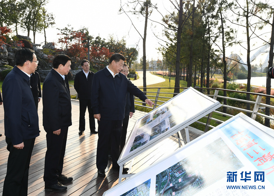 11月12日至13日,中共中央总书记、国家主席、中央军委主席习近平在江苏考察。这是13日下午,习近平在扬州市运河三湾生态文化公园考察,了解运河生态环境保护修复情况。新华社记者 谢环驰 摄