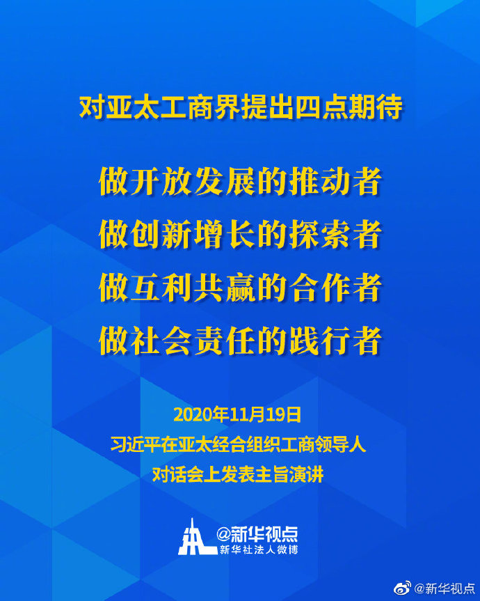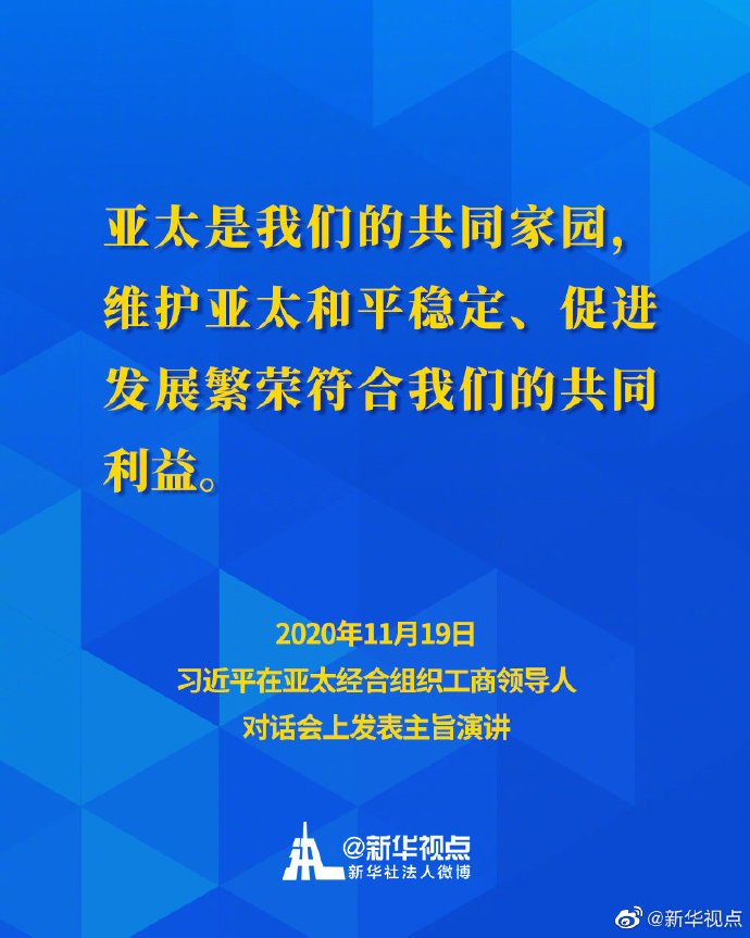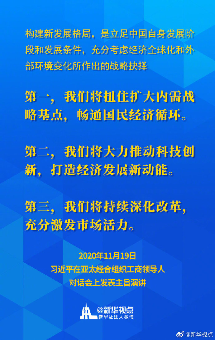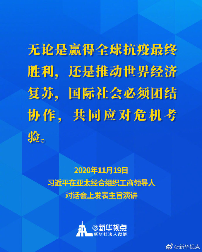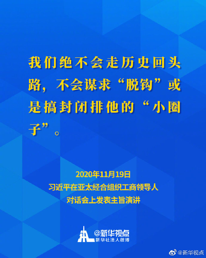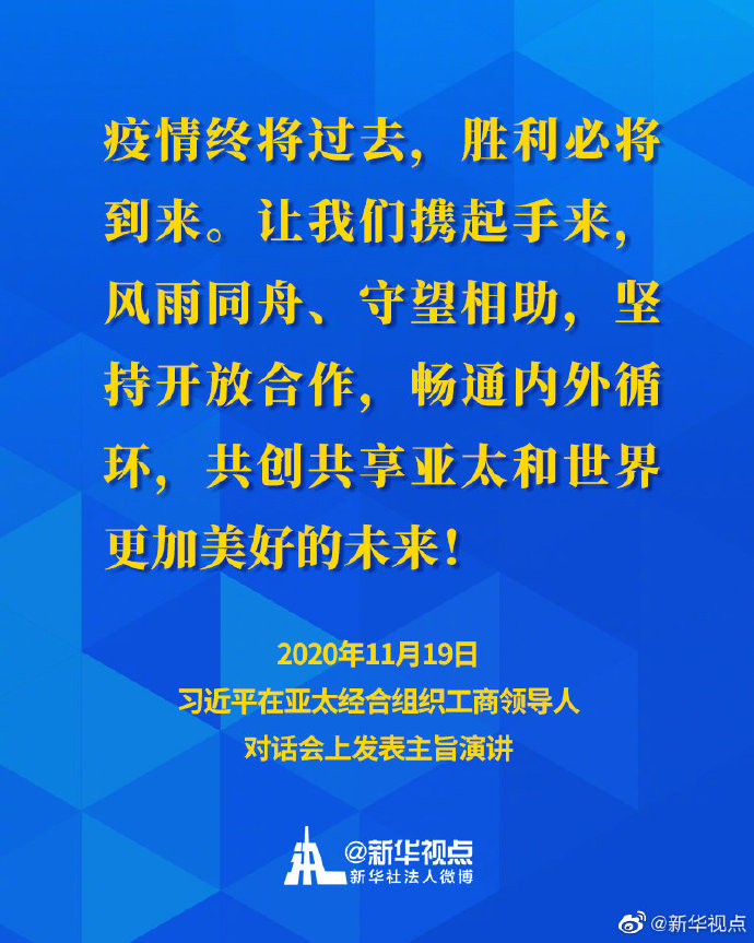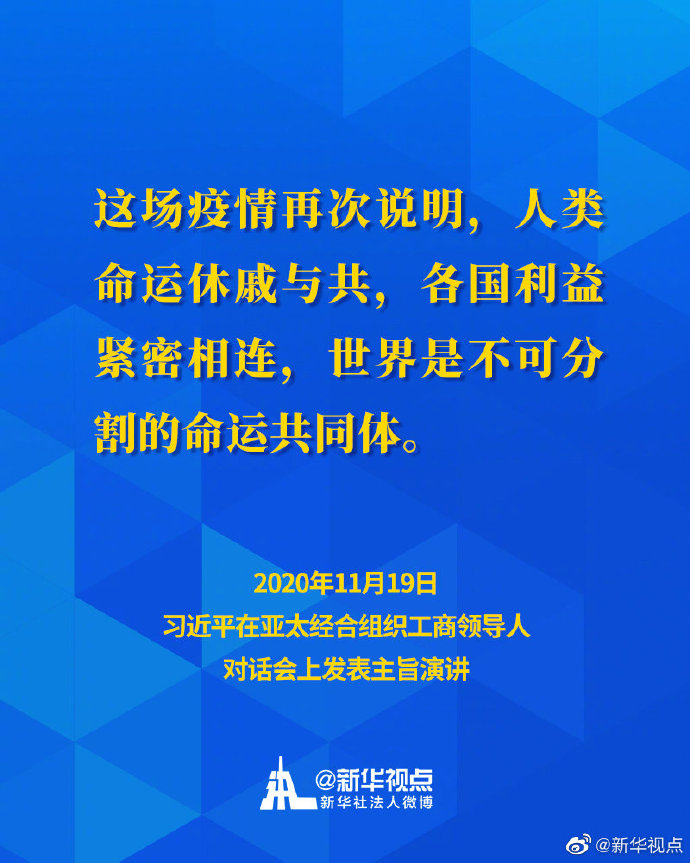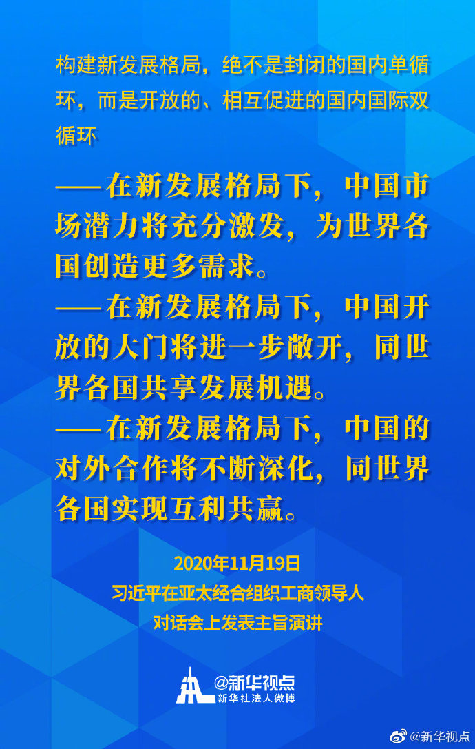 11月19日,国家主席习近平在亚太经合组织工商领导人对话会上发表题为《构建新发展格局 实现互利共赢》的主旨演讲。一起来看习主席演讲金句。