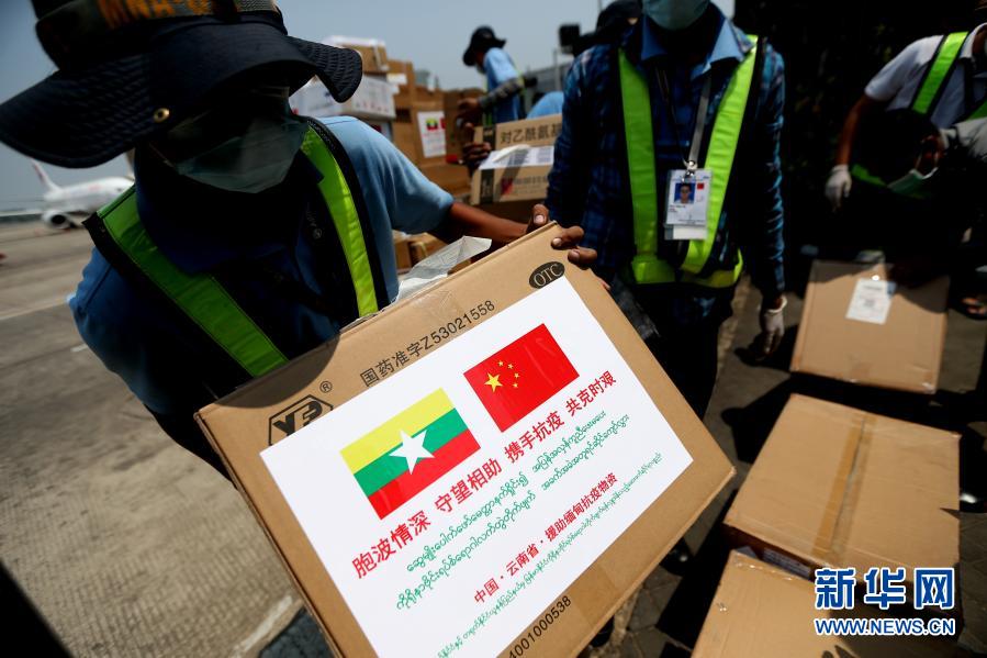 4月8日,在缅甸仰光国际机场,工作人员搬运中方捐赠的抗疫物资。中国政府派遣的抗疫医疗专家组当日抵达缅甸最大城市仰光,中方捐赠的一批防护用品、医疗设备和中成药等抗疫物资也随机抵达。新华社发(吴昂 摄)