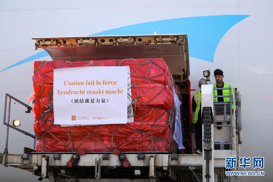 3月16日,在比利时列日机场,工作人员将口罩包裹运下飞机。来自中国的30万只口罩当地时间16日中午运抵比利时列日机场。这是欧洲新冠肺炎疫情暴发以来,比利时首次得到大规模外来援助。新华社记者 张铖 摄