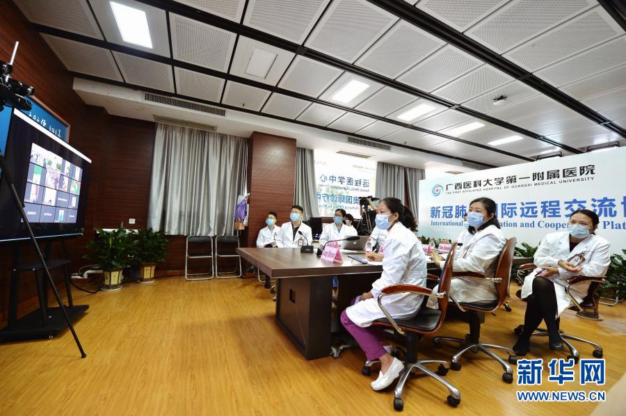 广西医科大学第一附属医院的专家通过视频连线的方式,与柬埔寨多家医院的医务人员分享、交流新冠肺炎疫情防控经验(4月20日摄)。新华社记者 崔博文 摄