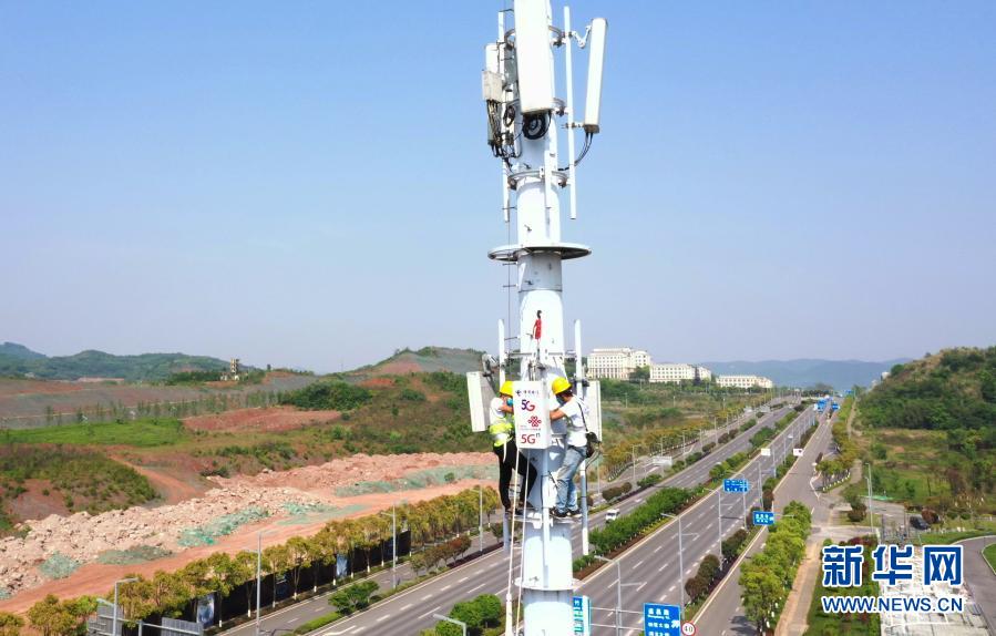 工作人员在位于重庆高新区高新大道的5G基站建设现场作业(4月15日摄,无人机照片)。新华社记者 王全超 摄
