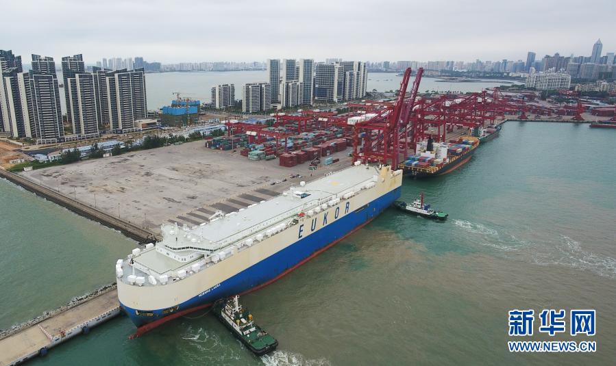 滚装货船“劳拉”轮驶入海口秀英港。这是海南自贸区政策实施以来的首艘汽车外贸船(2月16日摄,无人机照片)。新华社记者 杨冠宇 摄