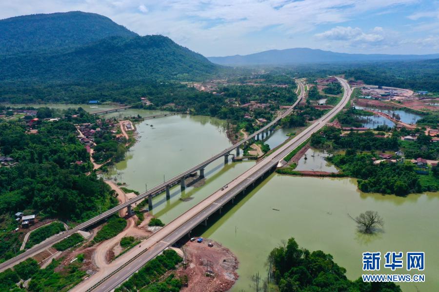 这是10月21日在老挝万象省航拍的建设中的万万高速桥梁(右)和中老铁路桥梁(左)。新华社发(云南建投集团供图)