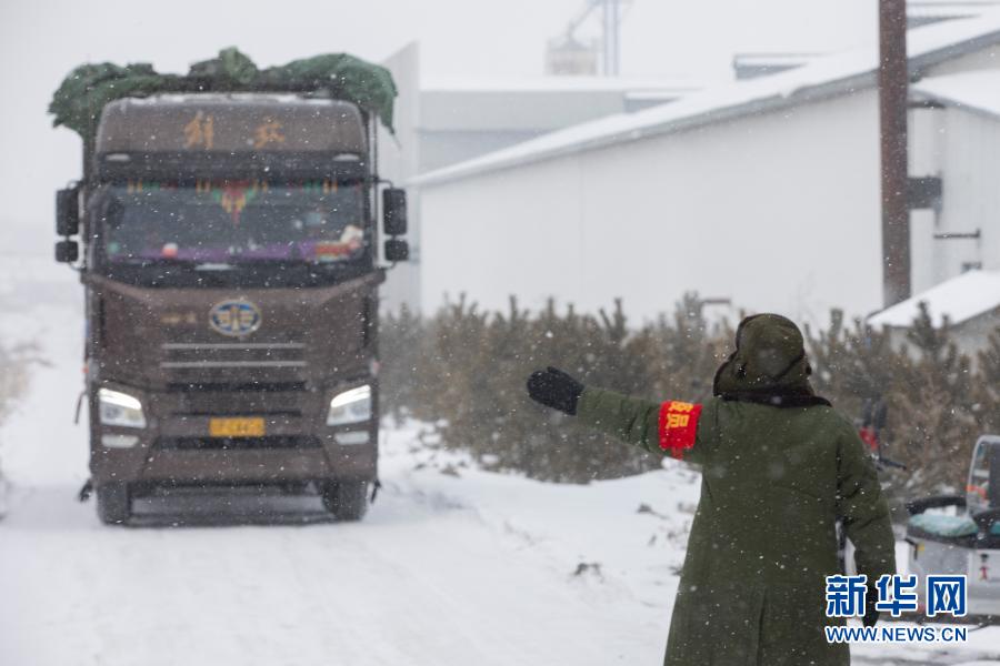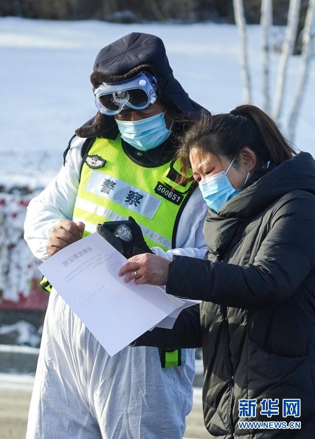 工作人员在黑龙江绥化市北林区宝山镇永发村村口拦截车辆(1月20日摄)。新华社发
