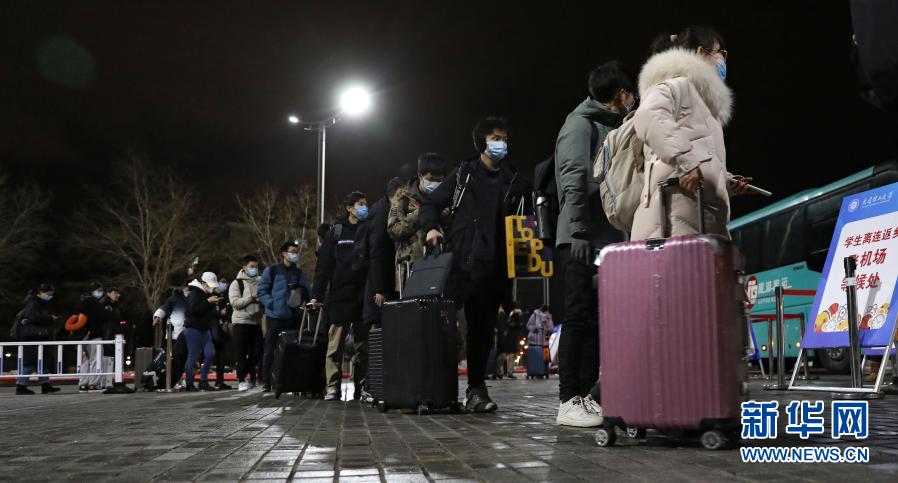 为保障学生防疫安全,1月18日到1月20日,大连理工大学用大巴车将2万余名学生送往机场、火车站、港口返乡。这是1月20日凌晨,学生们在校园里排队准备乘车。新华社记者 姚剑锋 摄