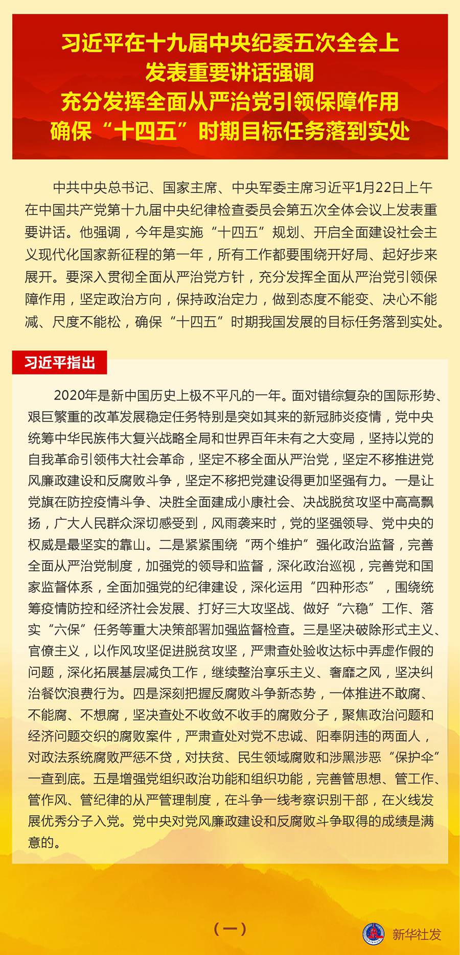 习近平在十九届中央纪委五次全会上发表重要讲话强调 充分发挥全面从严治党引领保障作用 确保“十四五”时期目标任务落到实处