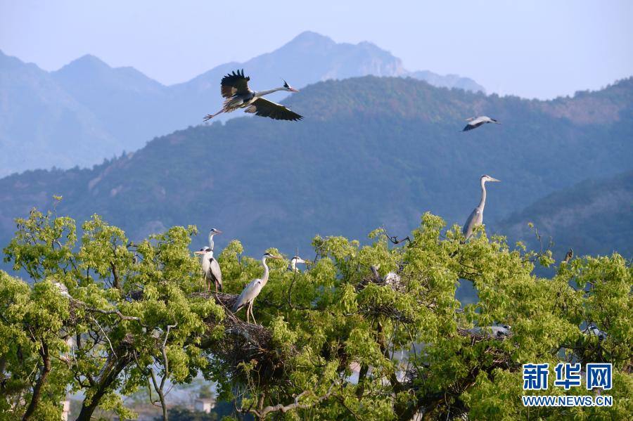 一群苍鹭在福建省罗源县碧里乡濂澳村后山树林中栖息(2020年4月15日摄)。新华社记者 姜克红 摄