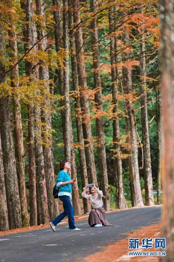 游客在福建省三明市将乐县龙栖山国家级自然保护区水杉大道游览(2020年11月19日摄)。新华社记者 宋为伟 摄