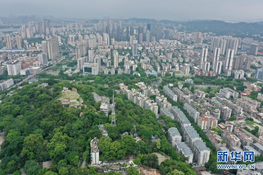 福州乌山历史风貌区的绿树及周围的城市景观(2020年9月10日摄,无人机照片)。新华社记者 林善传 摄