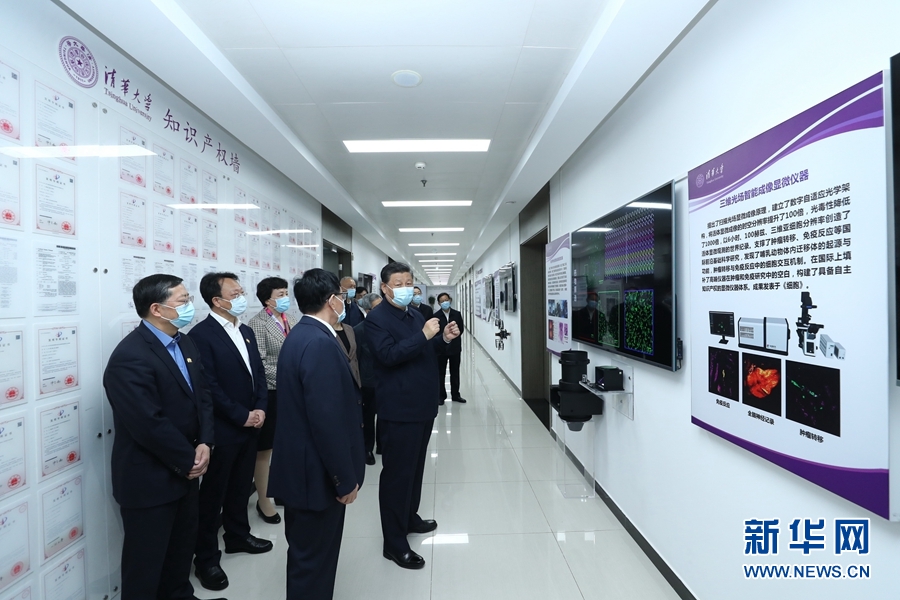 4月19日,在清华大学建校110周年校庆日即将来临之际,中共中央总书记、国家主席、中央军委主席习近平来到清华大学考察。这是习近平在清华大学成像与智能技术实验室,结合展板、电子屏幕察看实验室开展计算光学、脑科学与人工智能交叉科学实验研究和开发新科技应用场景情况,听取实验室理论研究、技术攻关、成果转化应用等情况介绍。新华社记者 鞠鹏 摄