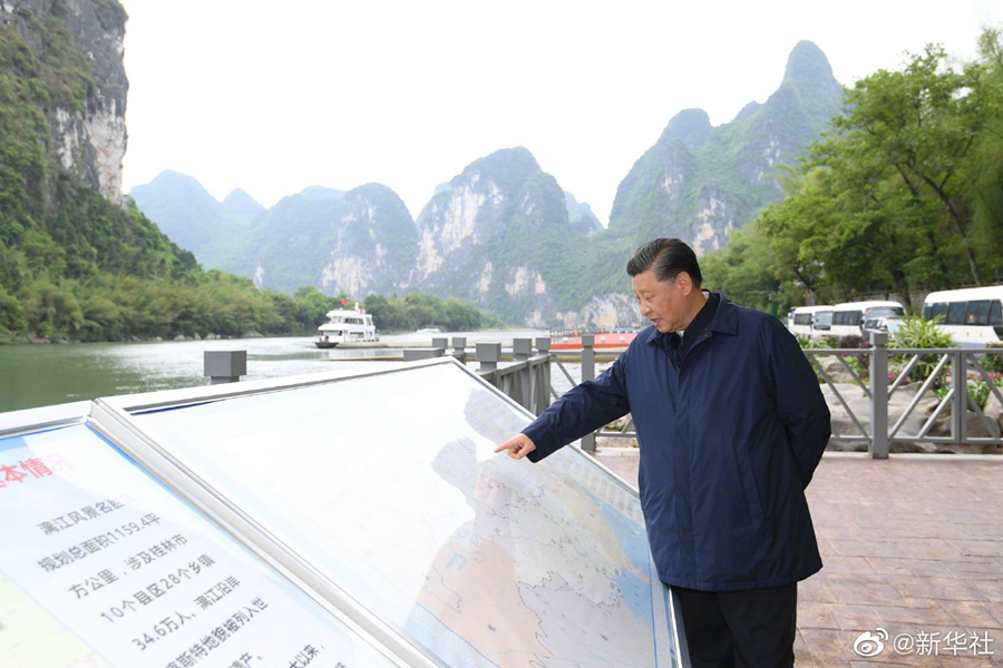 25日下午,正在广西考察调研的习近平总书记,来到桂林市阳朔县漓江杨堤码头,听取漓江流域综合治理、生态保护等情况汇报。当地负责同志告诉总书记,近年来桂林市大力推进漓江“治乱、治水、治山、治本”,全面清理整治采石场、非法采砂等。习近平指出,最糟糕的就是采石。毁掉一座山就永远少了这样一座山。全中国、全世界就这么个宝贝,千万不要破坏。再滥采乱挖不仅要问责,还要依法追究刑事责任。(记者:张晓松、朱基钗 摄影: 鞠鹏、谢环驰、申宏、殷博古)