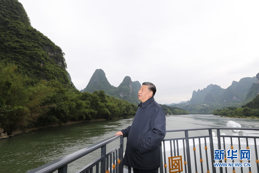 4月25日至27日,中共中央总书记、国家主席、中央军委主席习近平在广西考察。这是25日下午,习近平在桂林市阳朔县,乘船考察漓江阳朔段。 新华社记者 鞠鹏 摄