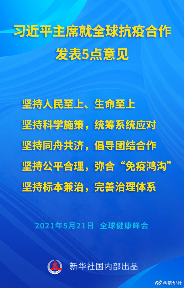 5月21日晚,国家主席习近平在北京以视频方式出席全球健康峰会并发表重要讲话。习近平主席就全球抗疫合作发表5点意见。