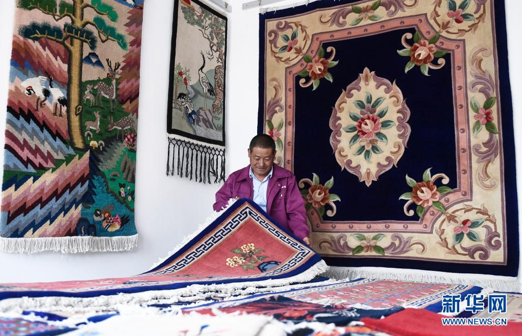6月5日,在西宁市湟中县上新庄镇加牙村,杨永良在整理制作好的藏毯。