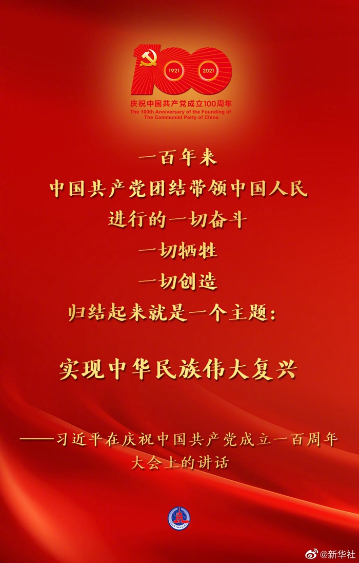 习近平说,中国共产党一经诞生,就把为中国人民谋幸福、为中华民族谋复兴确立为自己的初心使命。一百年来,中国共产党团结带领中国人民进行的一切奋斗、一切牺牲、一切创造,归结起来就是一个主题:实现中华民族伟大复兴。