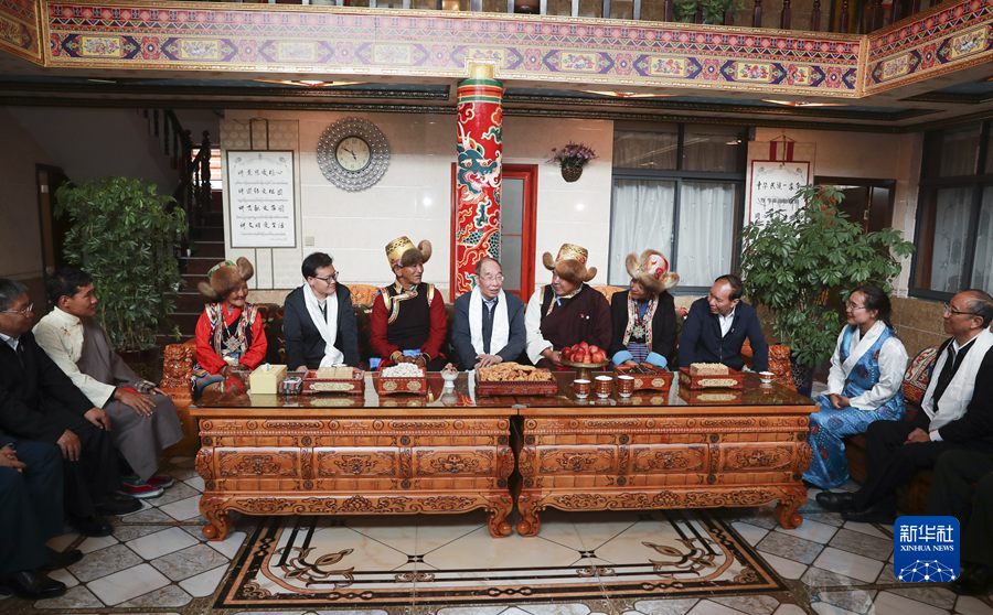 8月20日,中央代表团山南、日喀则分团带着以习近平同志为核心的党中央的深切关怀和全国人民的深情祝福,分别看望慰问当地各族各界干部群众。这是中共中央书记处书记、中央统战部部长、中央代表团副团长尤权率山南分团在山南市乃东区昌珠镇扎西曲登社区走进居民次仁家看望慰问。新华社记者 丁林 摄